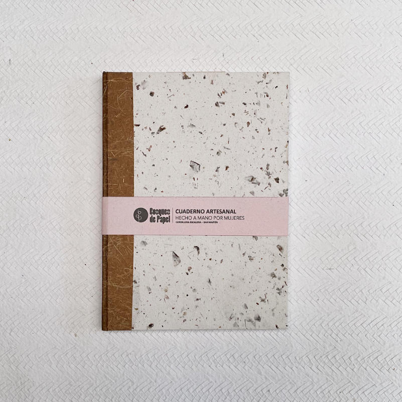 Tapa forrada en papel reciclado de cartón con incrustación de bagazo de uva. Lomo en papel de fibra de plátano oscuro.